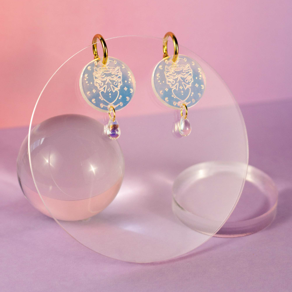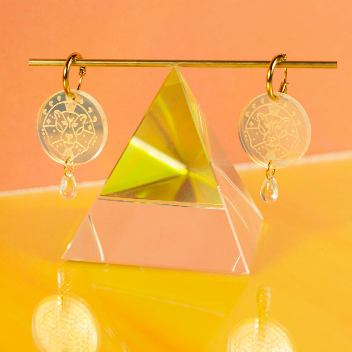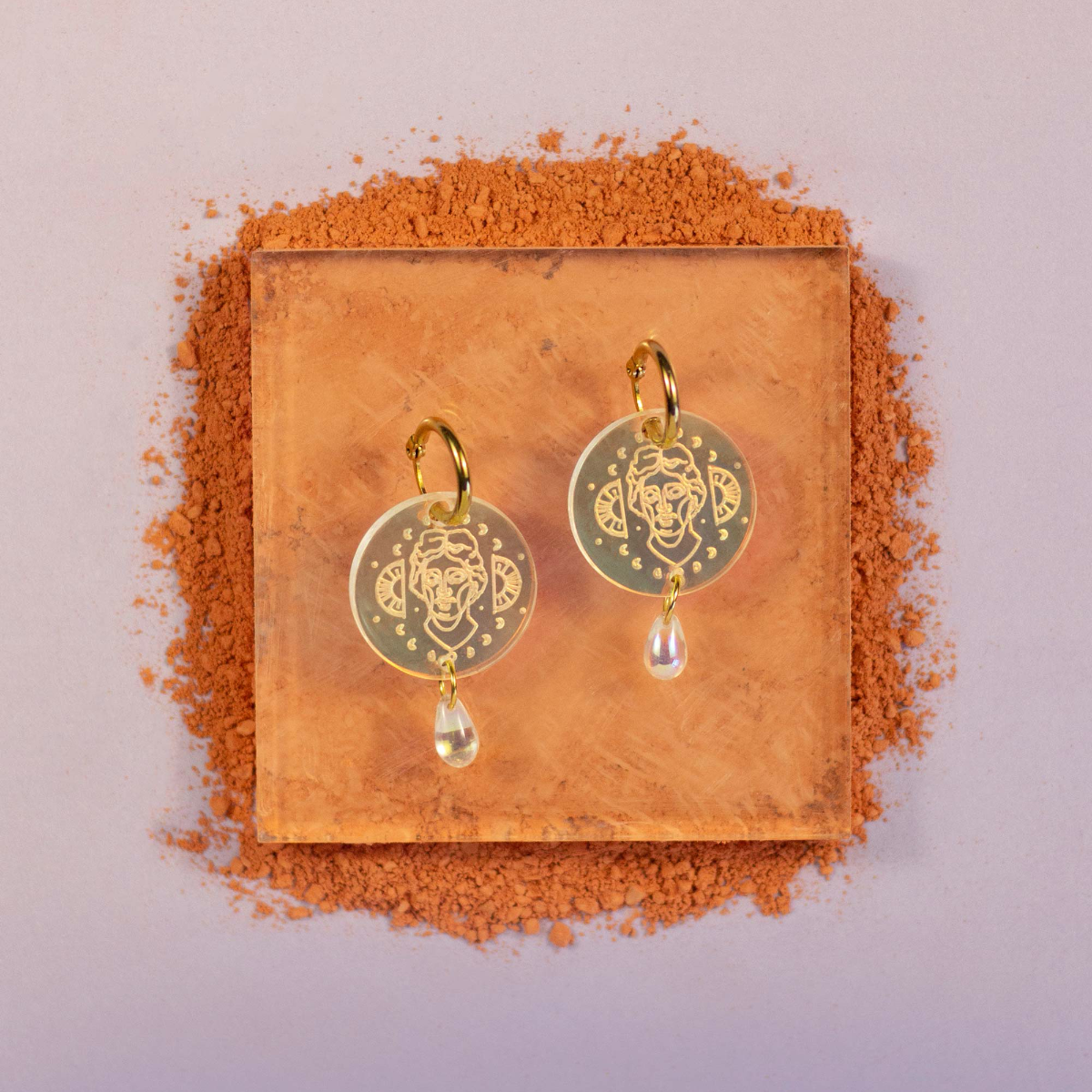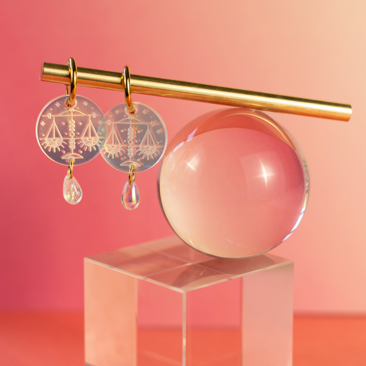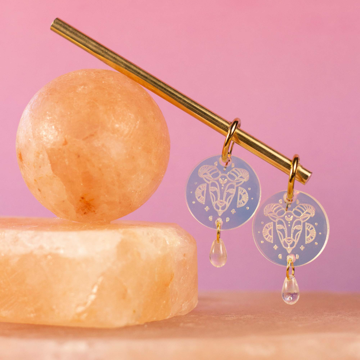 Hey baby, what’s your sign? These iridescent earrings are shimmery and beautifully change colors whenever they move from lilac to peach, and shade of blue. The small glass tear-shaped bead is reflective and shimmery, the perfect addition to these zodiac-themed earrings.